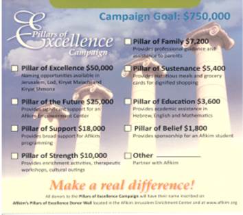 In February 2015 the Afikim Family Enrichment Association launched its first major fundraising campaign, the Pillars of Excellence Campaign with a goal of raising $750,000 for the expansion and growth of the Afikim programs across the country. As Afikim enters its eighth year, Afikim’s 12 branches are at full capacity servicing nearly 500 children at […]